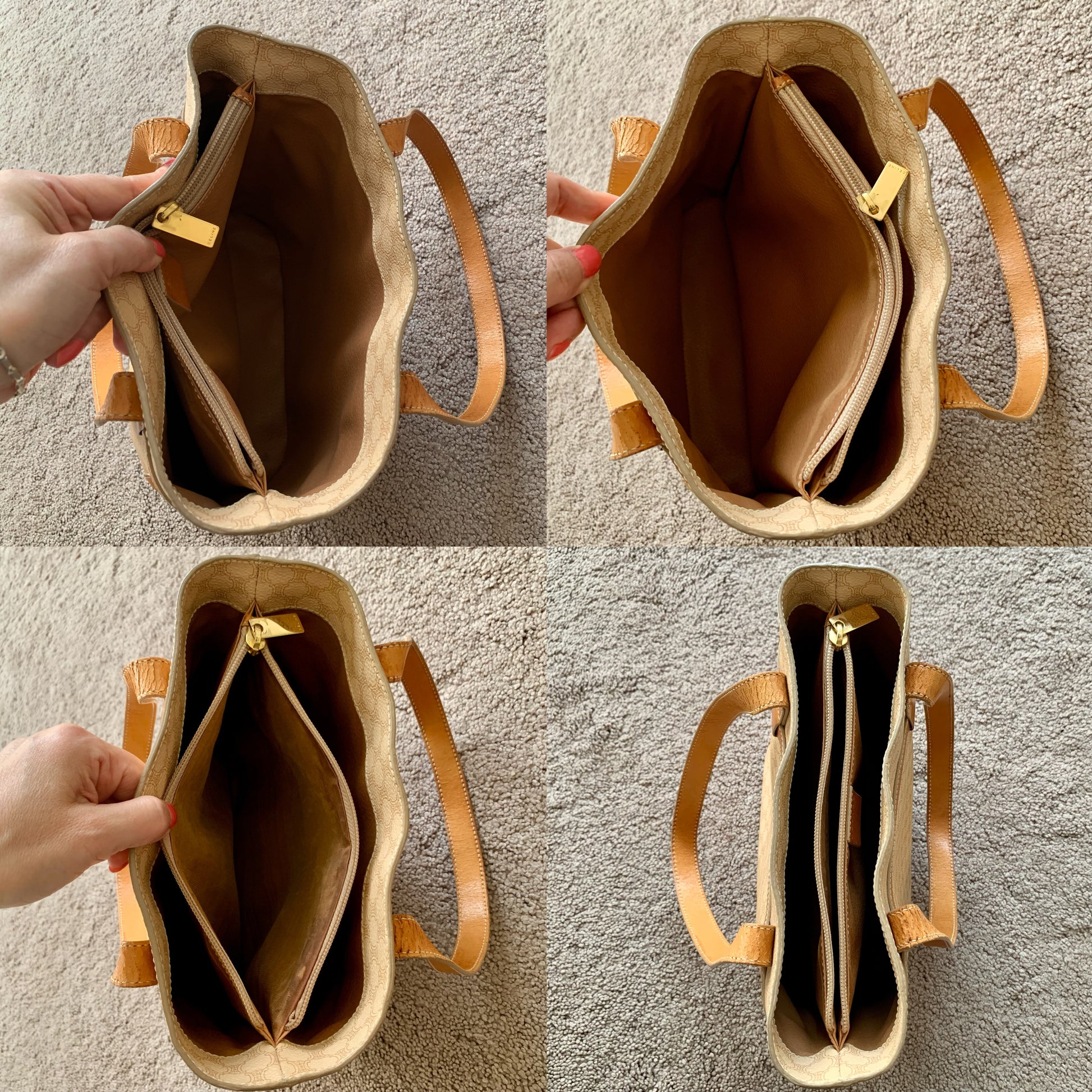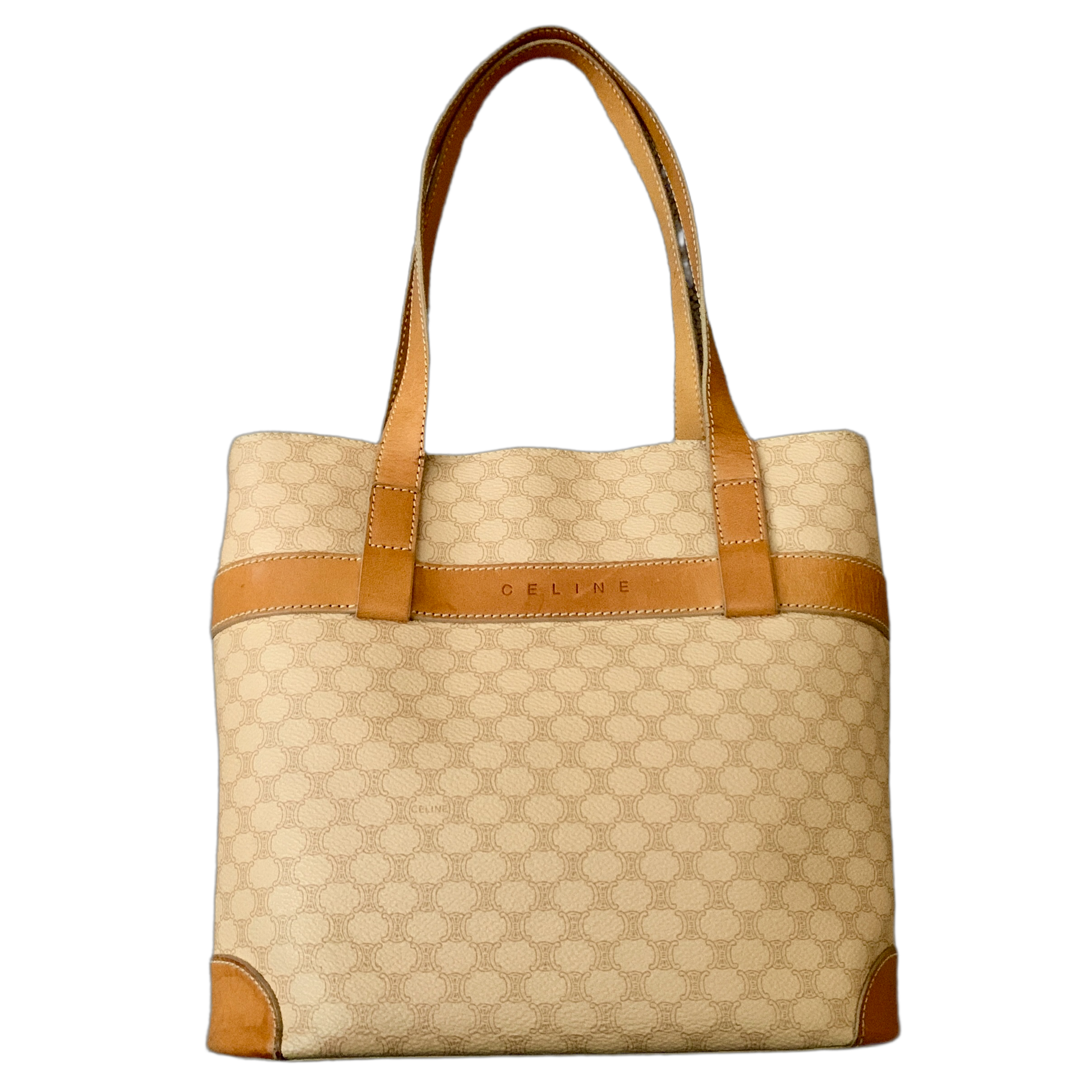 Authentic Celine vintage triumph women’s tote bag in leather and canvas. Color beige and brown. Signs of use on bag and hardware including some stains inside and scuffs on handles as shown in pictures. Measurements in pictures.