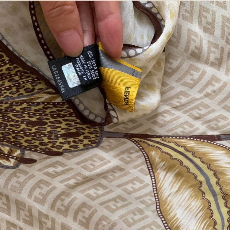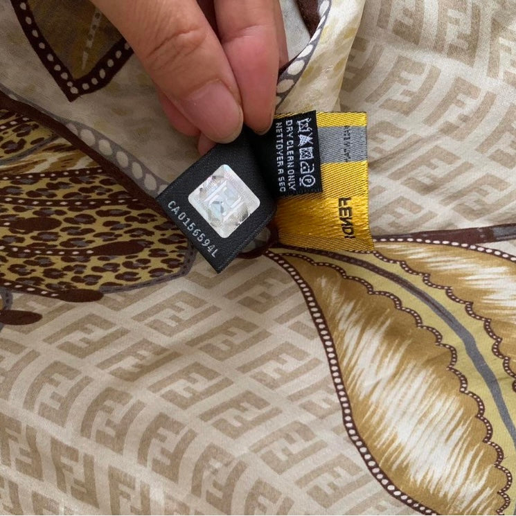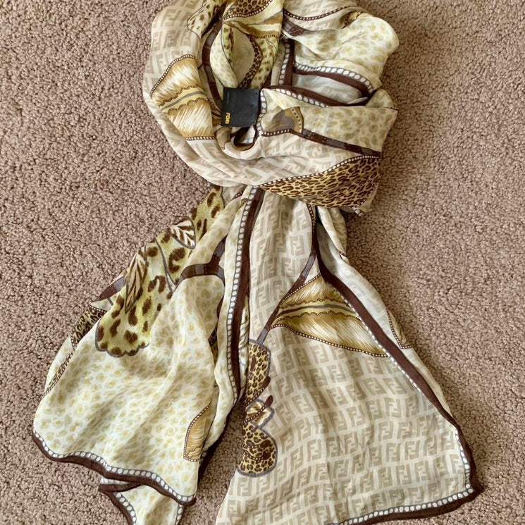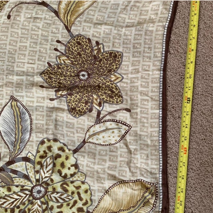 Authentic Fendi FF monogram women’s silk scarf in brown, beige and ivory color in great condition as shown in pictures. Size is around 170x64.5 cm or 66.93x 25.39 inch. A few pulled threads from normal wear.