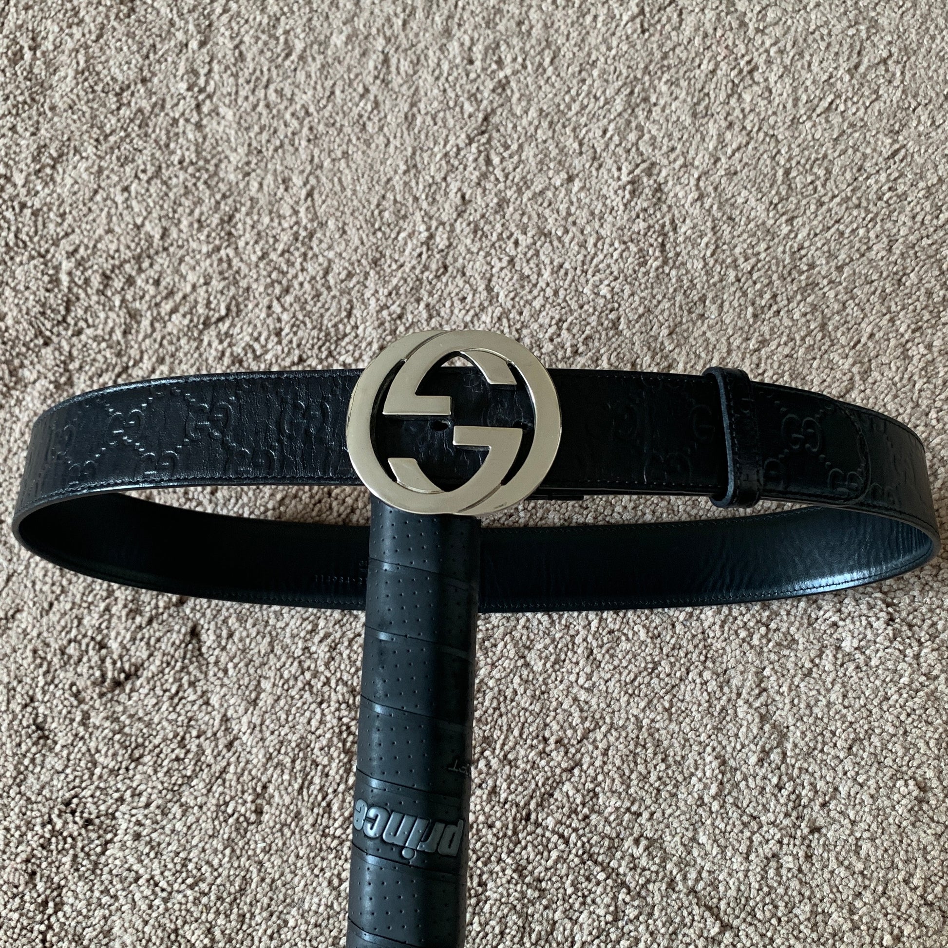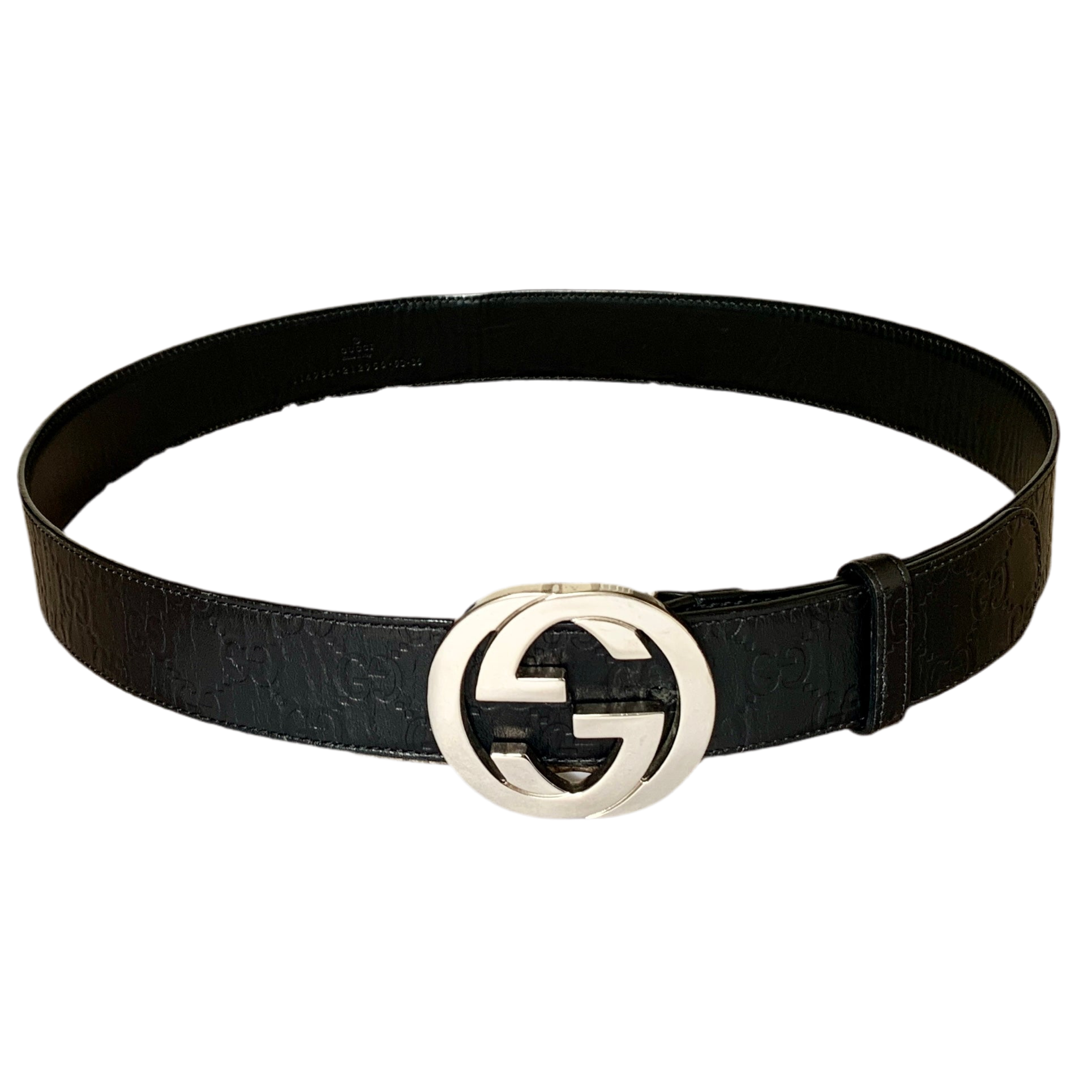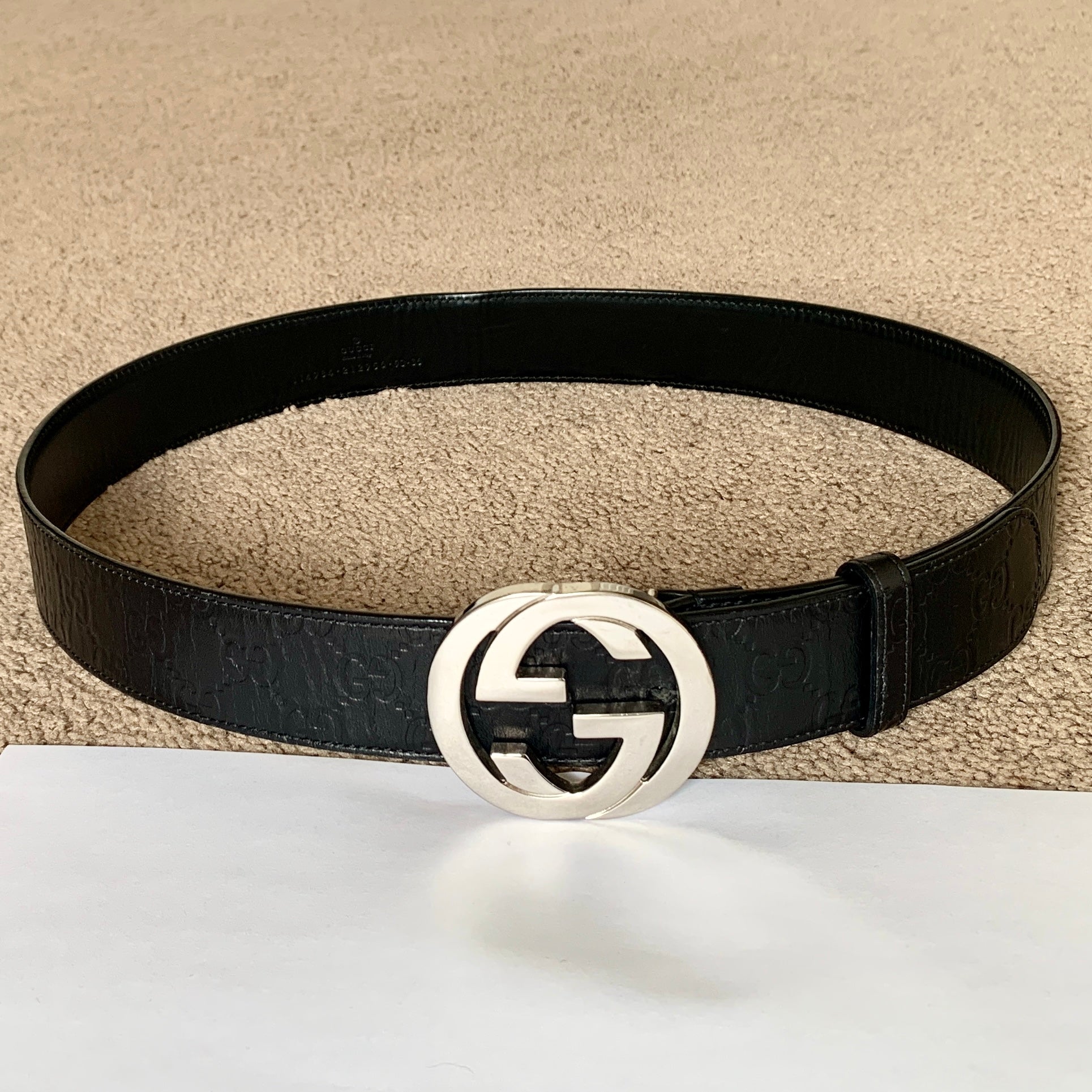 Authentic Gucci signature unisex monogram black leather belt with GG interlocking silver buckle in excellent condition. Small signs of use on buckle and leather as shown in pictures. Size 90 cm or 36 inches marked on belt. Length without buckle is around 100 cm/39.37 Inches, and width around 3.8 cm/1.5 Inches as shown in pictures.
