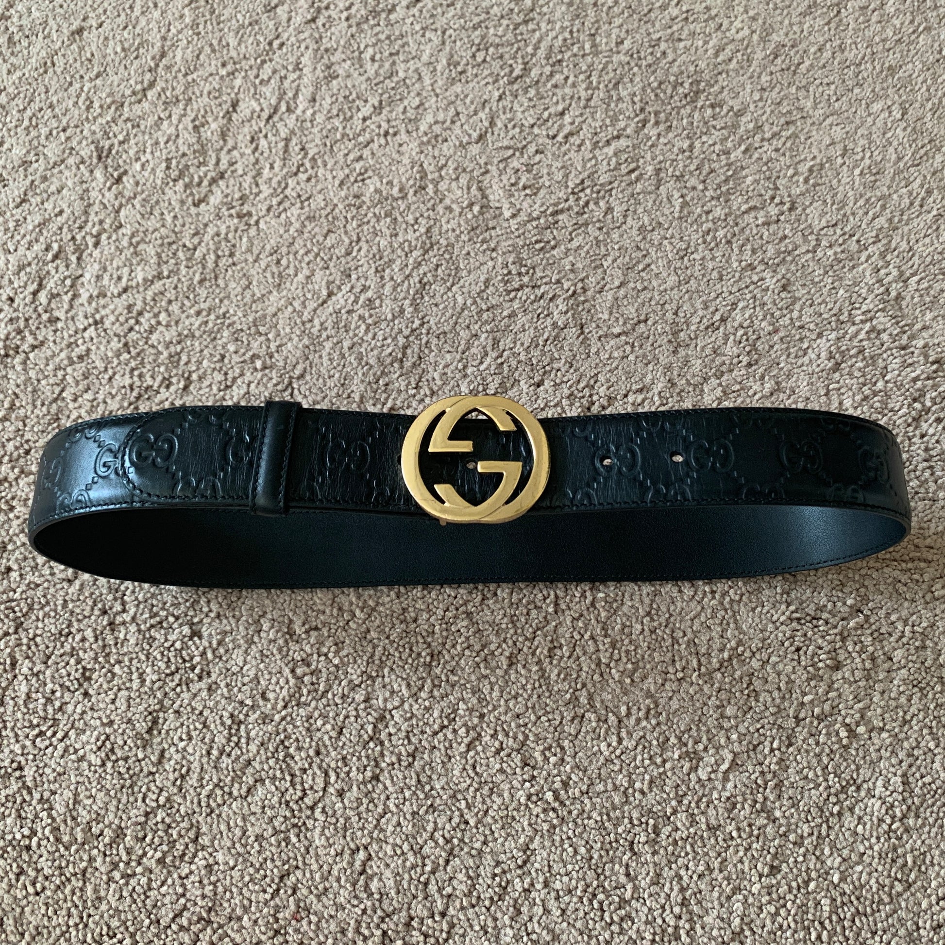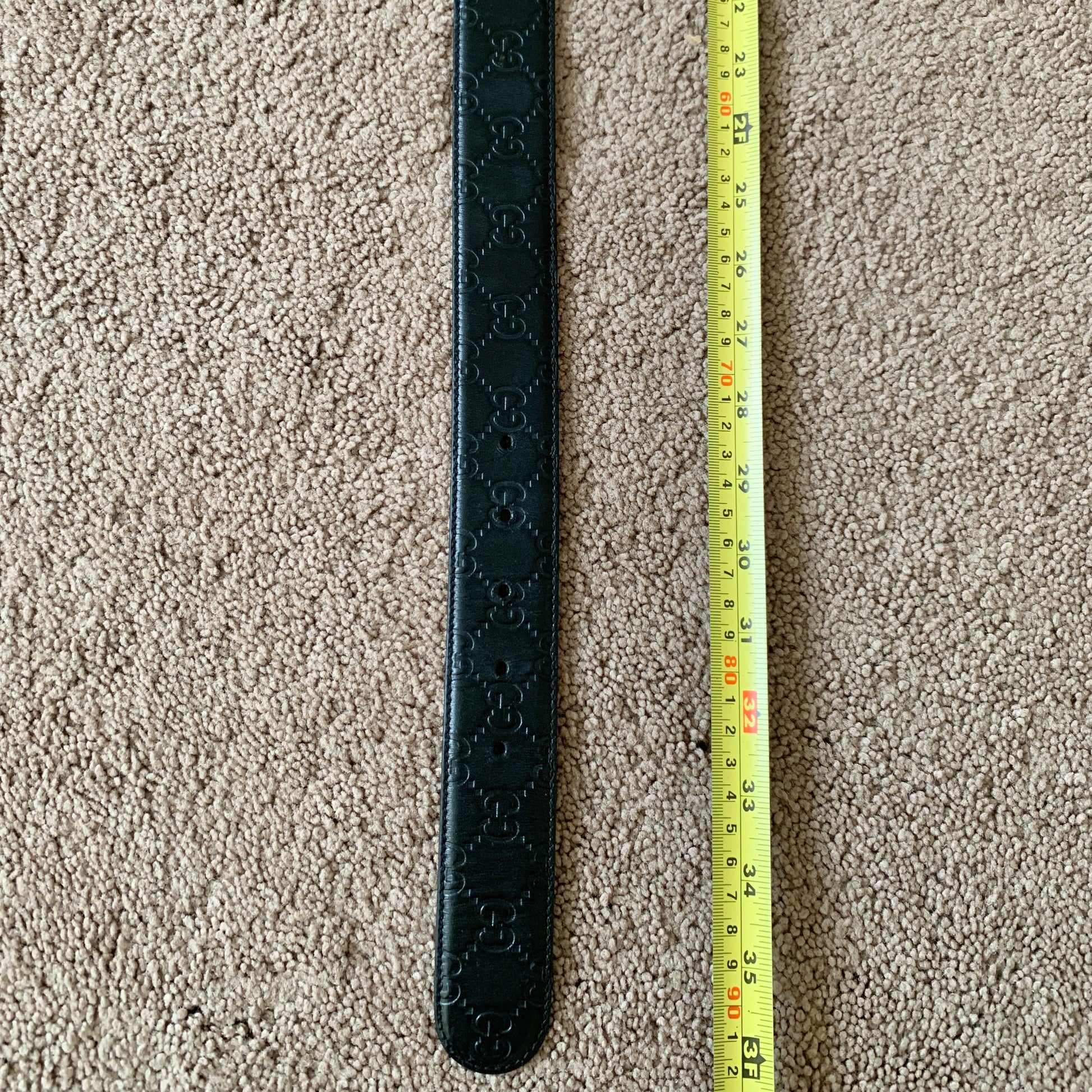 Authentic pre-loved Gucci unisex signature GG monogram black leather belt with GG interlocking gold buckle in great condition. Signs of use on buckle and leather as shown in pictures. Size 80 cm or 32 inches marked on belt. Length without buckle is around 92 cm/36.22 Inches, and width around 3.6 cm/1.42 Inches as shown in pictures.