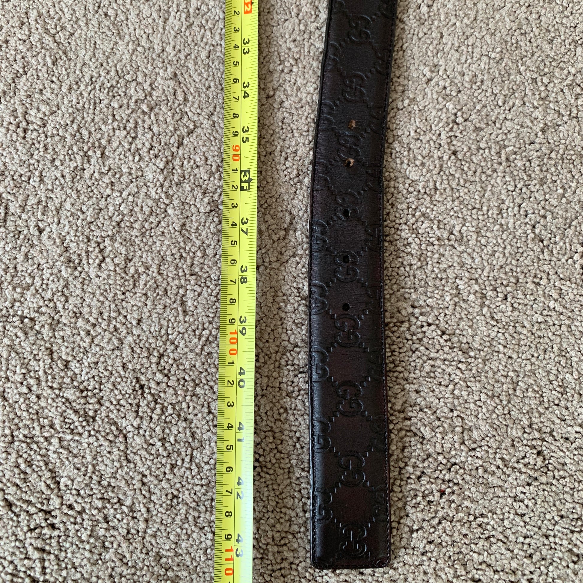 Indulge in effortless elegance with the Authentic Gucci unisex signature monogram dark brown leather belt. Made with luxury in mind, this belt is the perfect accessory to elevate any outfit. The iconic Gucci monogram adds a touch of sophistication, while the high-quality leather ensures comfort and durability. Upgrade your style with this timeless piece.