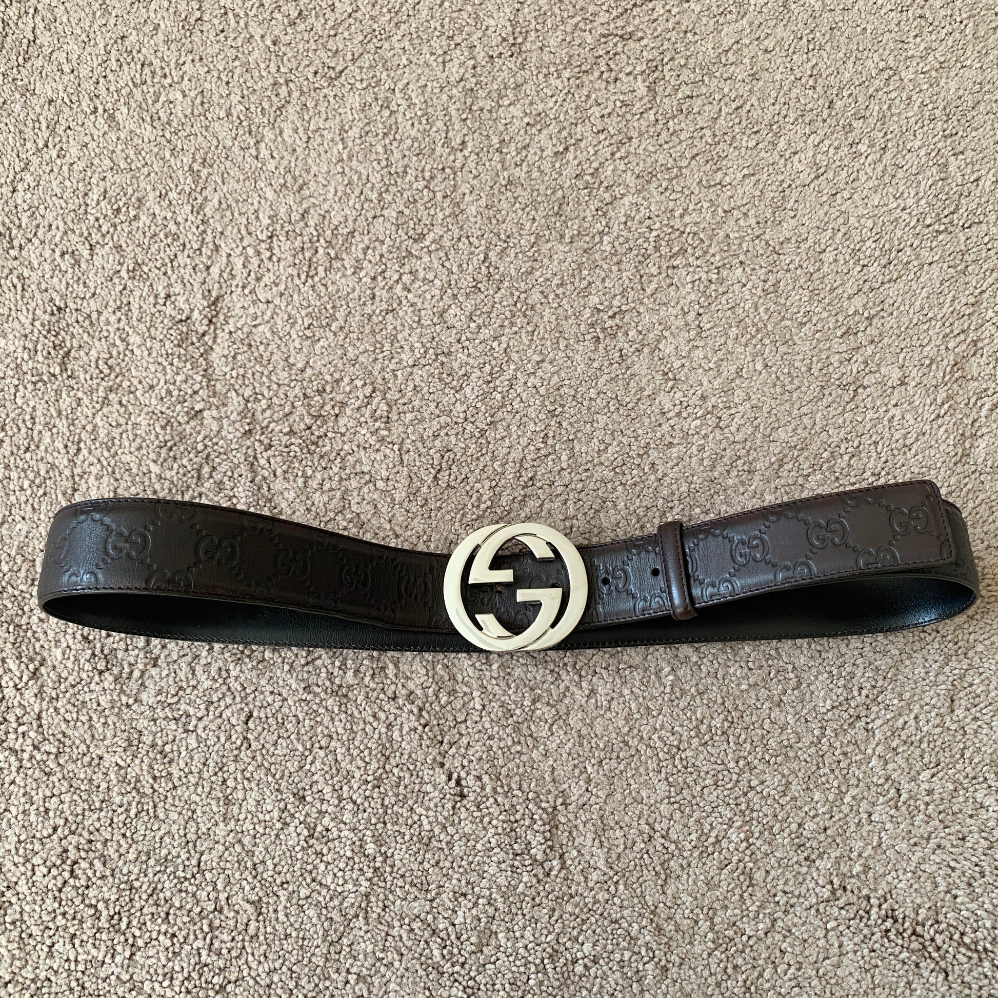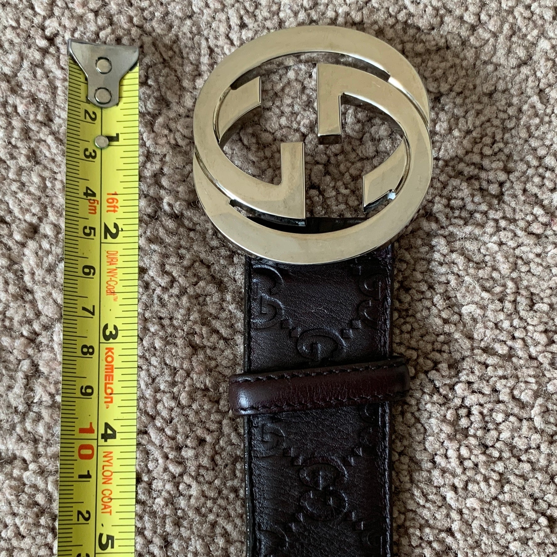 Authentic Gucci unisex signature GG monogram dark brown leather belt with GG interlocking silver buckle in great condition. Some signs of use on buckle and leather as shown in pictures. Size 100 cm or 40 inches marked on belt. Few extra holes added as shown in pictures. Length without buckle is around 110.5 cm/43.50 Inches, and width around 3.8 cm/1.5 Inches as shown in pictures.