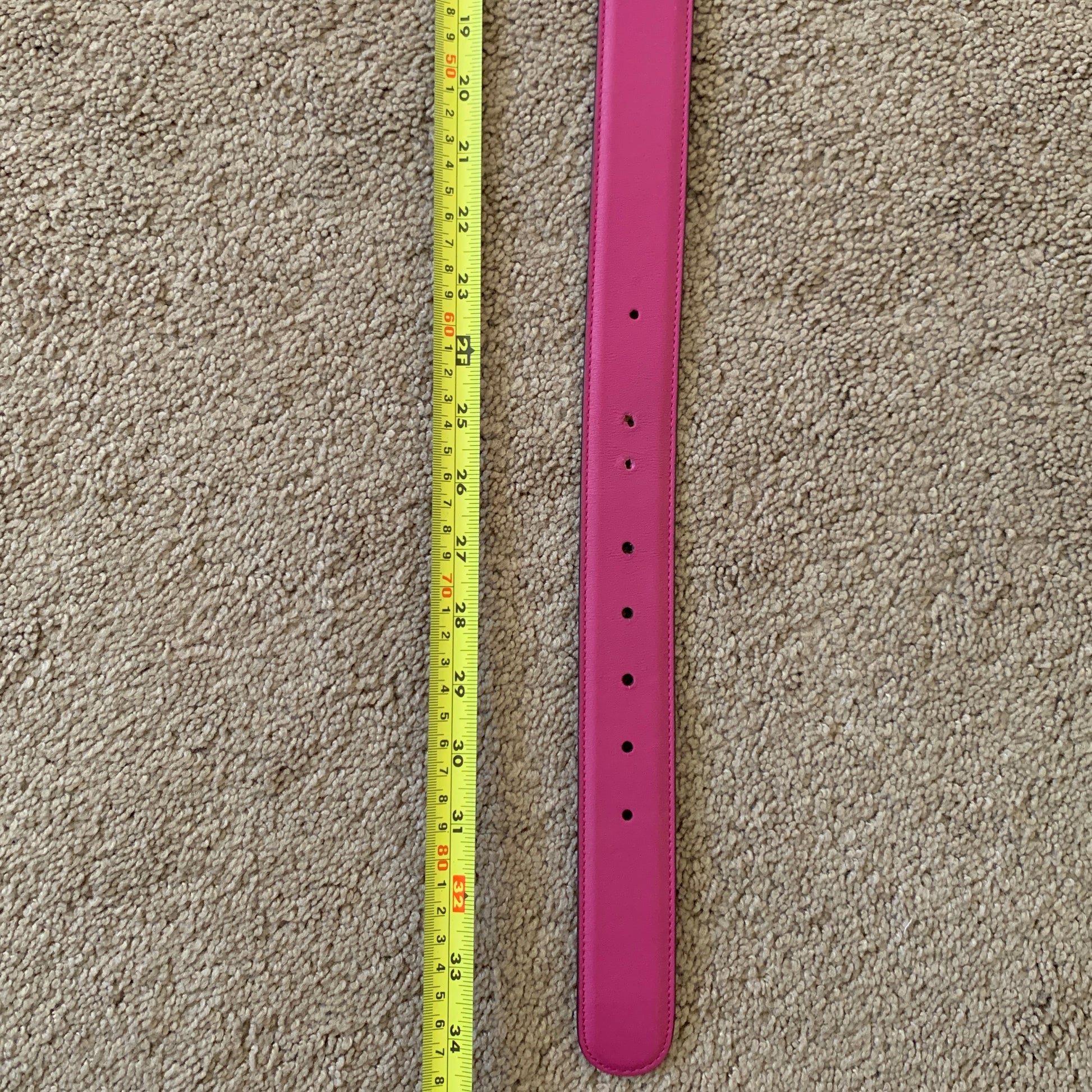 Authentic Gucci fuchsia leather belt with GG interlocking gold buckle in great condition. Some signs of use on buckle and leather as shown in pictures. Extra holes added as shown in pictures. Size 75 cm or 30 inches marked on belt. Length without buckle is around 88 cm/34.65 Inches, and width around 3.6 cm/1.42 Inches as shown in pictures.