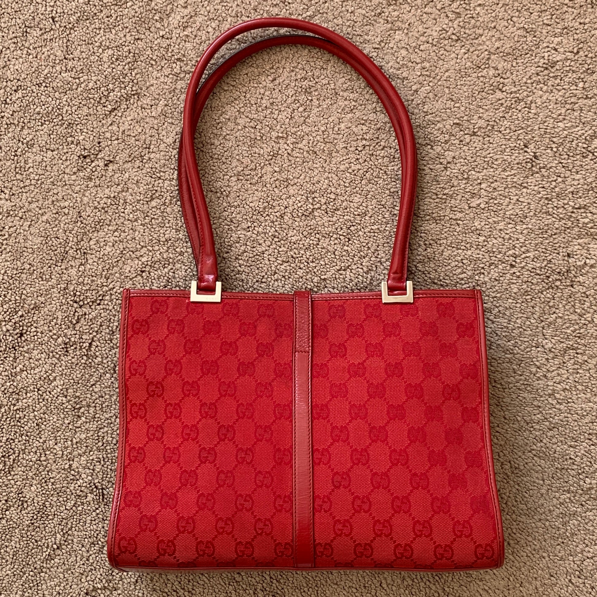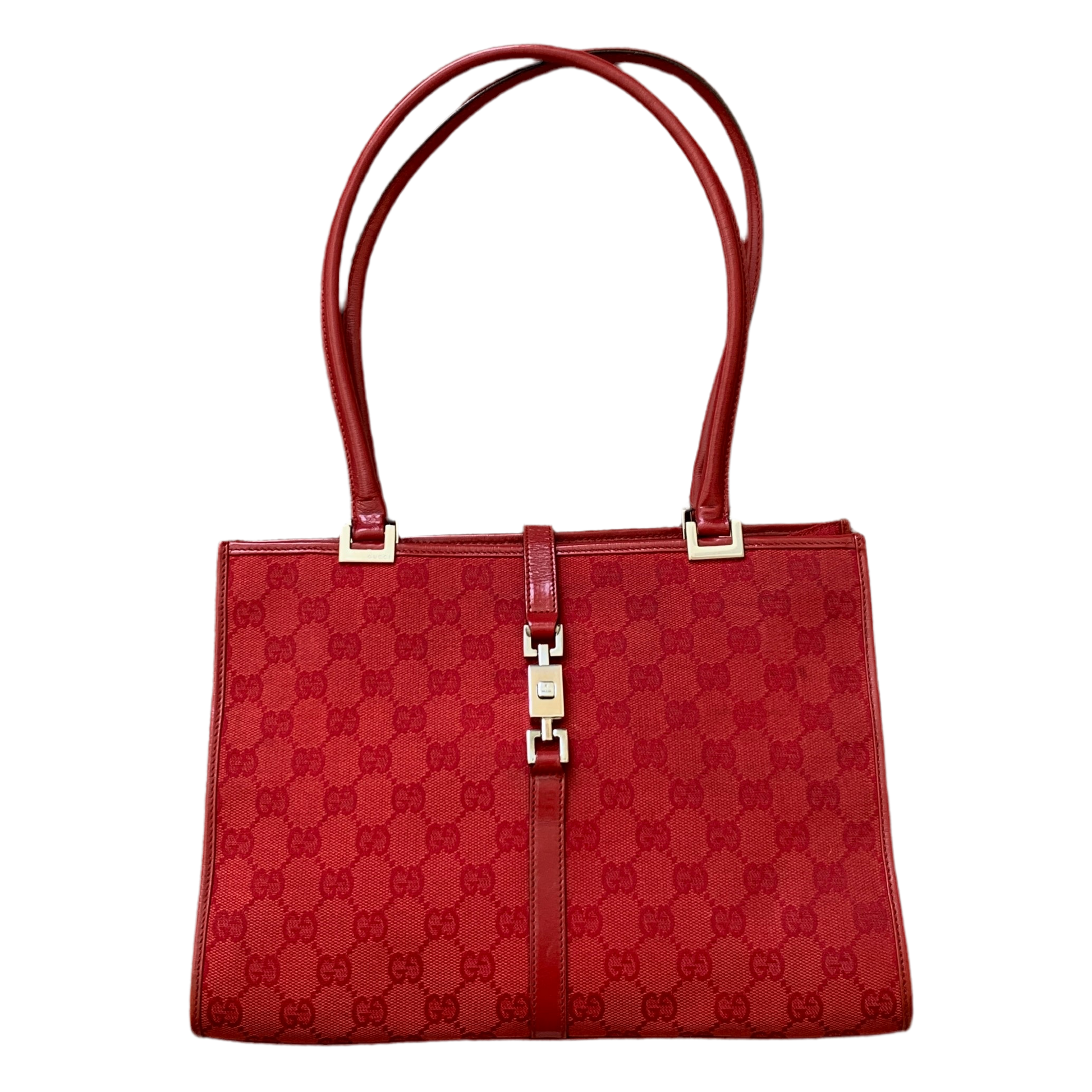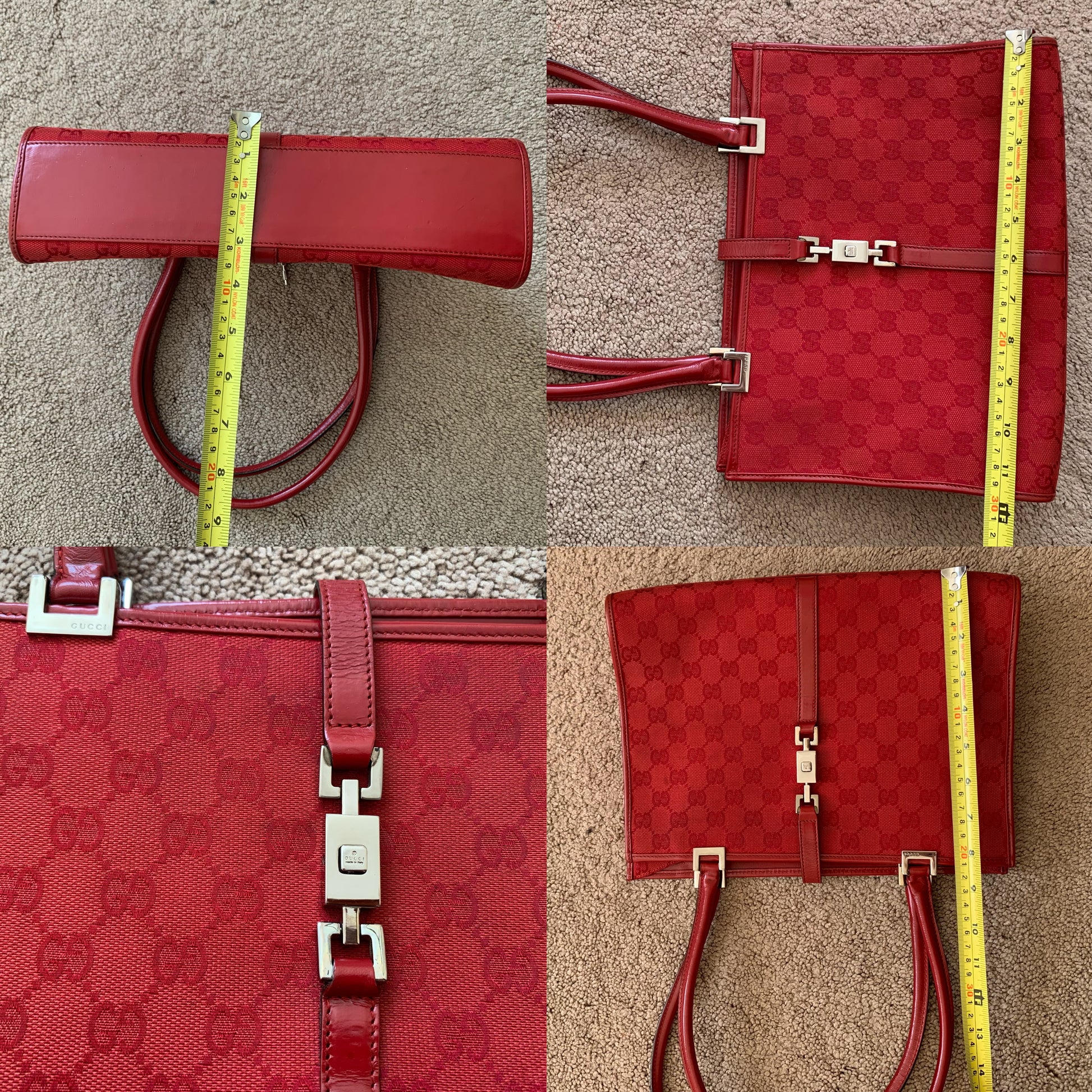 Authentic Gucci women’s red GG canvas and leather Jackie handbag in excellent condition. Signs of use as shown in pictures. Measurements in pictures.